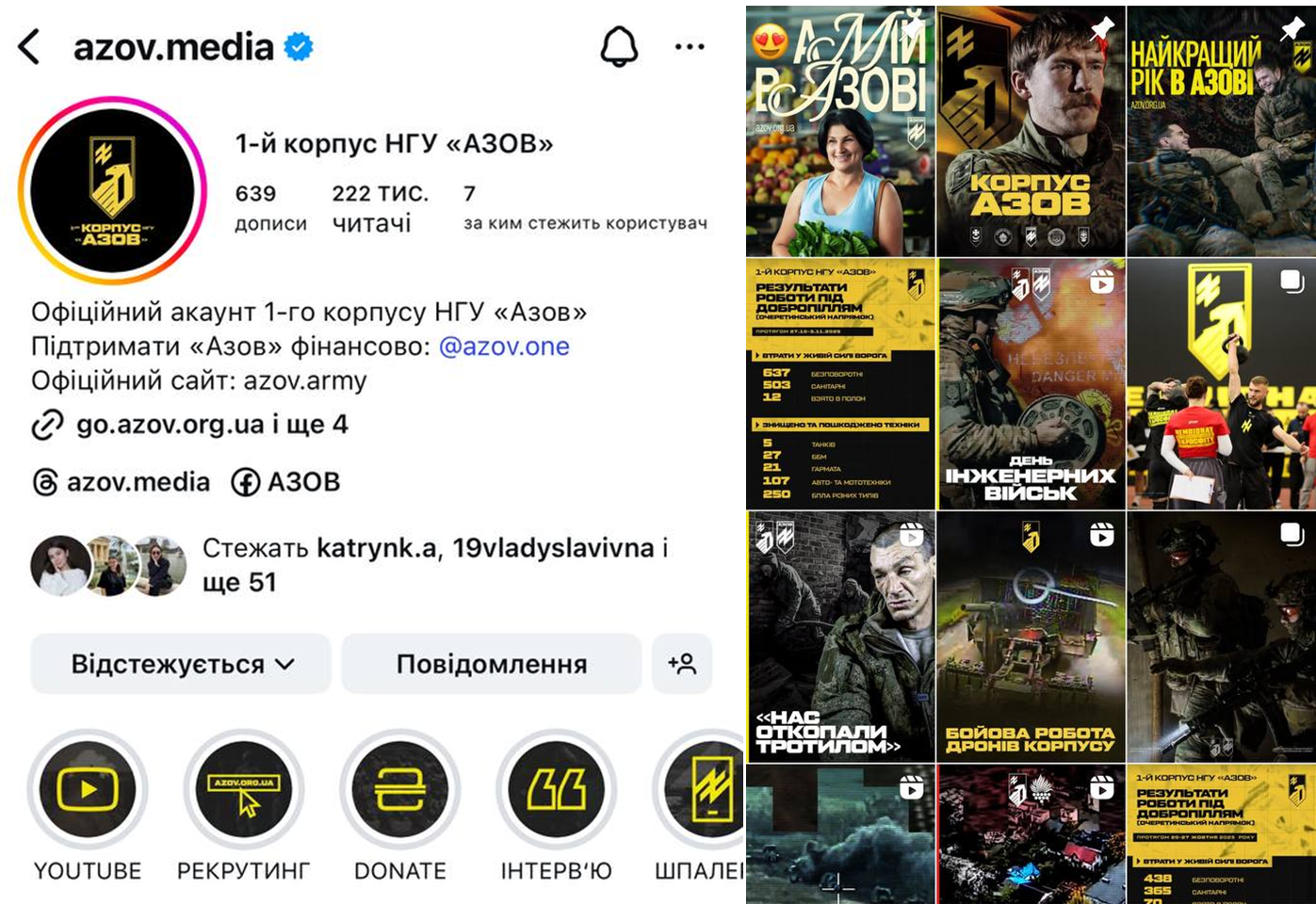 Cоцмережі підрозділу – YouTube, Telegram, Instagram, X і навіть TikTok – не лише розповідають про роботу підрозділу, а й дозволяють підтримувати зв’язок із суспільством, залучати добровольців і знаходити фінансову підтримку. Активна присутність бригади як в онлайн просторі, так і на білбордах, радіо, телебаченні формує інформаційне поле сили. “Азов” ставить собі за мету не просто показувати війну, а керувати тим, як вона сприймається суспільством.