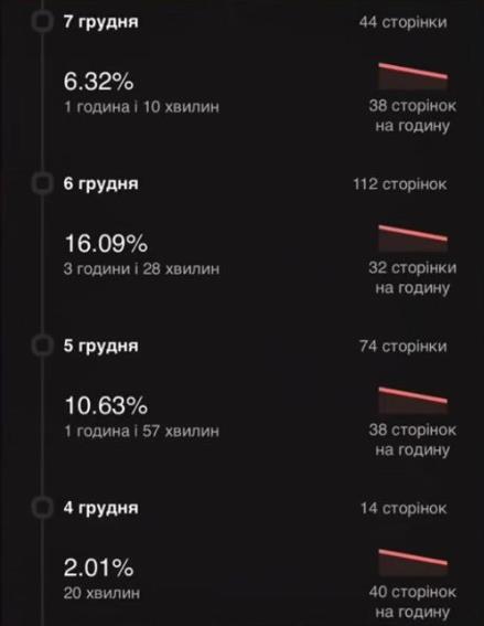 Замість того, щоб насолоджуватися читанням, ви починаєте «гнати» по тексту, аби графік не пішов униз. Читання перетворюється на забіг, де зупинка для роздумів прирівнюється до поразки. Особливо деструктивною виявилася функція «прогнозу закінчення читання», яка провокує спробу перегнати алгоритм і прочитати розділ швидше, ніж розрахувала програма.