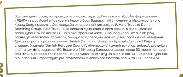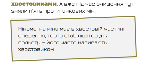 Сам текст поділений на частини ілюстраціями з підзаголовками. А для розуміння лексики є вставки, в яких є визначення. Наприклад в тексті розповідають, що поле всяне осколками та хвостовиками. Останнє слово виділено жирним шрифтом, а під реченням таке пояснення: «Мінометна міна має в хвостовій частині оперення, тобто стабілізатор для польоту – його часто називають хвостовиком». А в кінці тексту є втавка, що не відомо чи зачищають поля незаконні збройні сили «ЛДНР» і розповідається про допомого від закордонних партнерів.