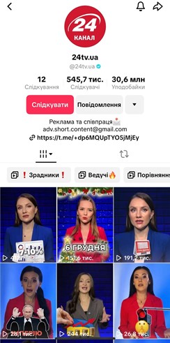 Українські медіа вже давно зрозуміли, що ігнорувати TikTok неможливо. Так, наприклад, 24 Канал обрав шлях експериментів. У статті «Продовжуємо зростати: TikTok 24 Каналу об’єднав понад півмільйона підписників» керівник відділу соцмедіа Яромир Вдович зазначив, що команда 24 Каналу неодноразово змінювала формат, тестувала нових ведучих, експериментувала з темами та підлаштовувалася під глядачів й тренди.