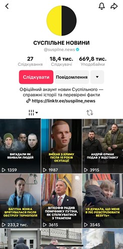 Медіа Суспільне Новини обрало трохи інший шлях. Відео у їхньому TikTok-акаунті містять новини про наслідки обстрілів, обміни полоненими, заяви влади, міжнародну політику, історії людей, пояснення складних тем простою мовою тощо.