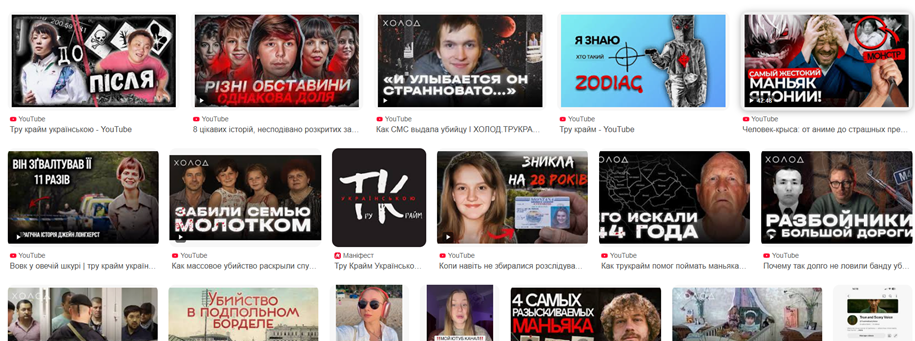 Результати пошуку відео за запитом «тру-крайм» на YouTube.